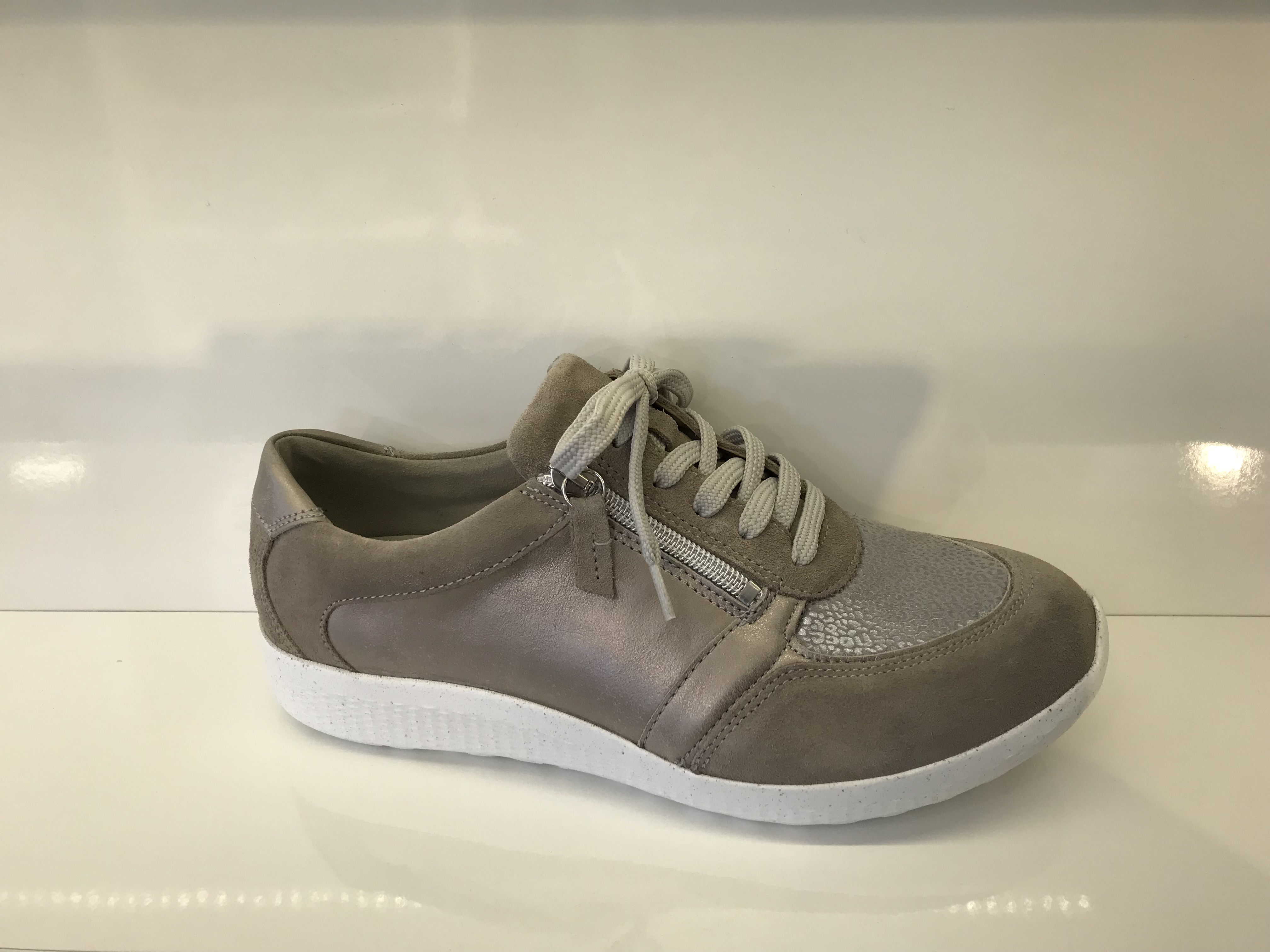 Damenhalbschuhe von Waldläufer; Obermaterial: Lederkombi (Nubuk-Glanzleder) mit Strechmaterial; Innenmaterial: Lederfutter; Orthotritt; herausnehmbares Fußbett; verstellbar durch Schnürung und einem zusätzlichem Reißverschluss; Sehr leichtes Modell; Helle Sohle; Weite M; Farbe: Grey/Stein