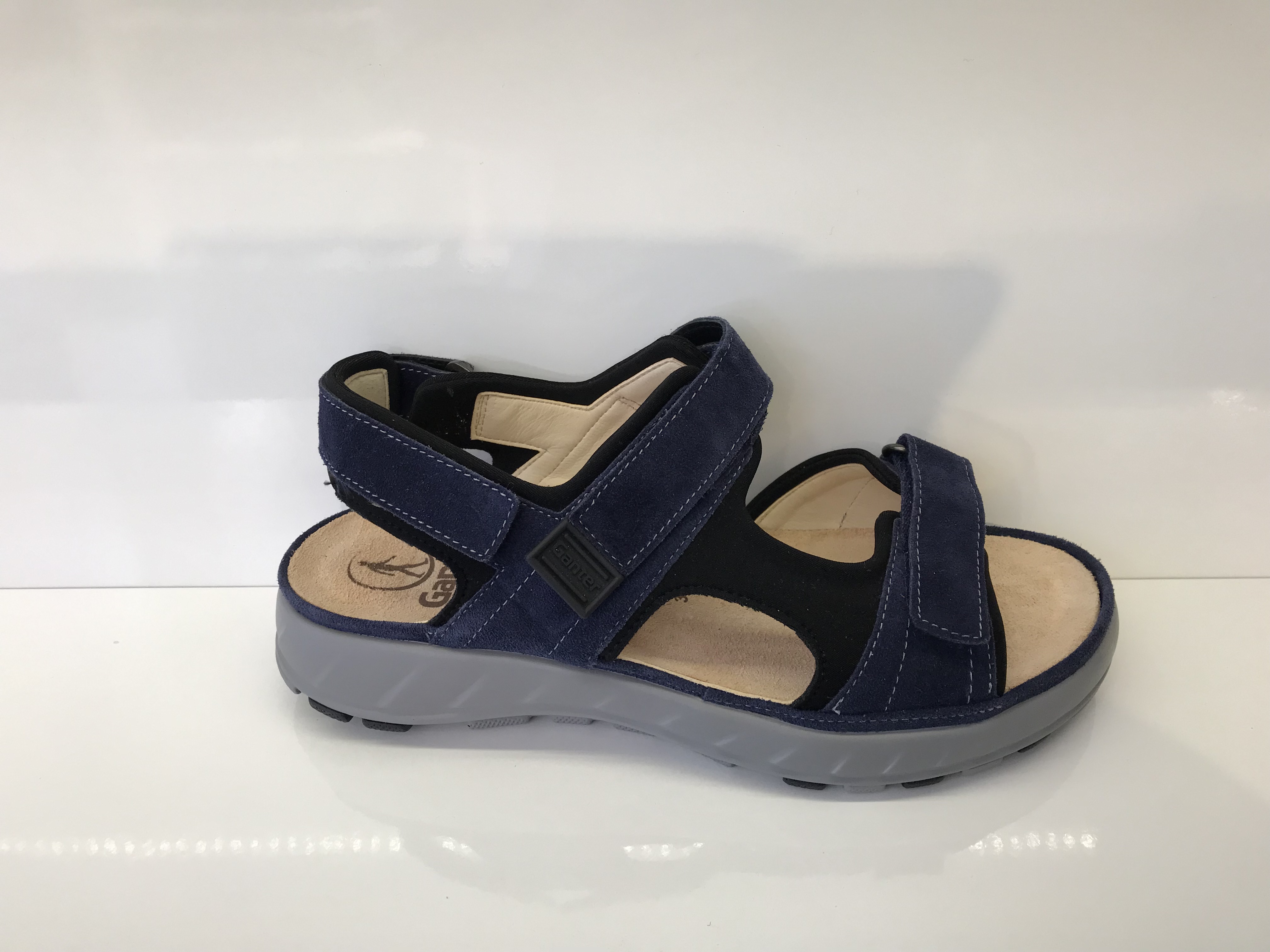Damensandale von Ganter; Obermaterial: Casualvelourleder und Strechmaterial; Innenmaterial: Lederfutter; herausnehmbares Leichtkorkfußbett; verstellbar durch zwei Klettverschlüsse; Fersenriemen verstellbar durch einen Klettverschluss; Sohle: 4 Punkt-Sohle (rutschhemmend und stoßdämpfend); helle Sohle; Weite G; Farbe: Navy (Dunkelblau)