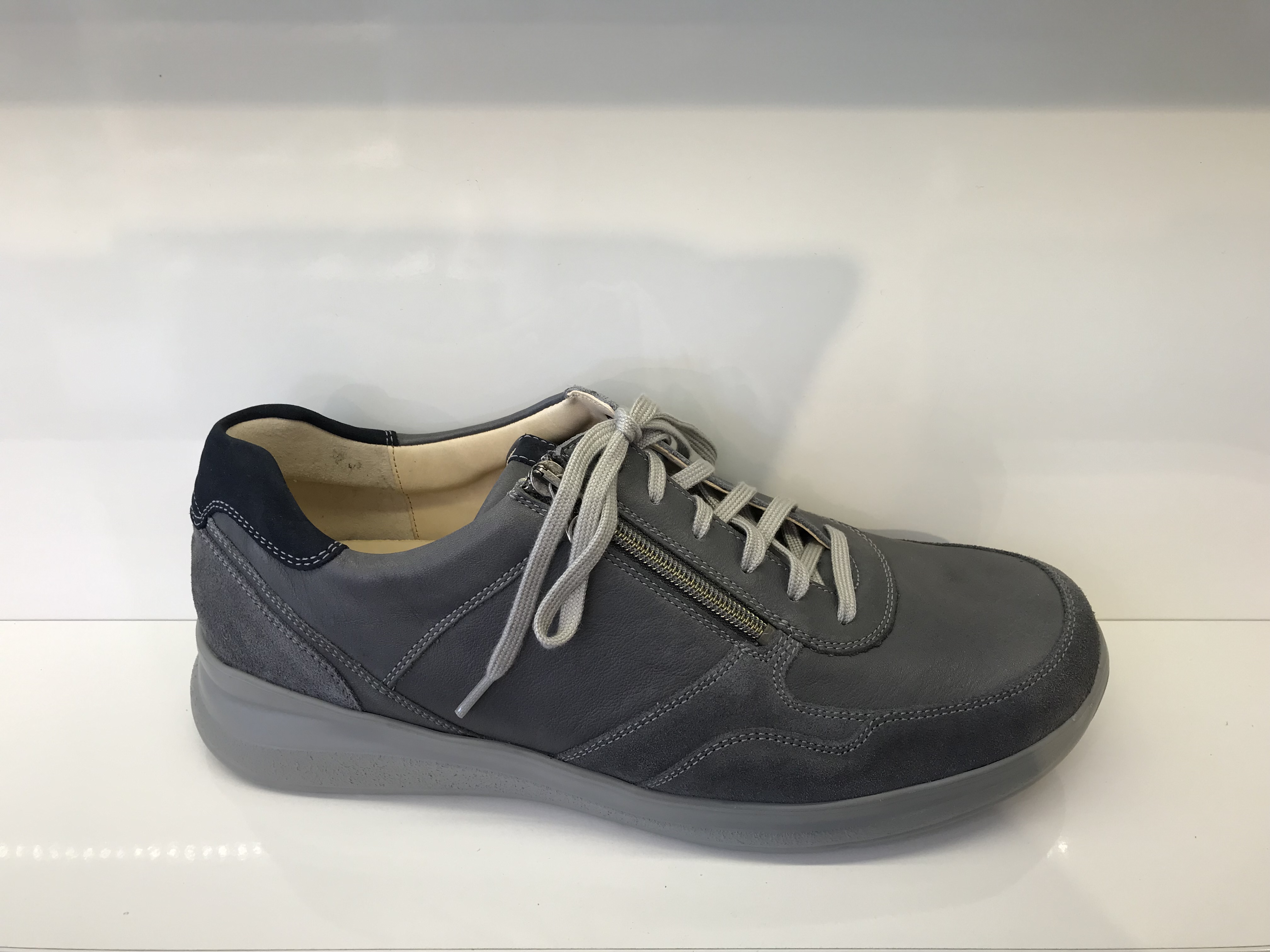 Herrenhalbschuhe von Ganter; Obermaterial: Nappaleder und Velourleder; Innenmaterial: Lederfutter; herausnehmbares Leichtkorkfußbett; verstellbar durch Schnürung und Reißverschluss auf der Aussenseite; Weite H; Stoßdämpfende 4-Punkt-Sohle; Graue Sohle; Farbe: Greyblue