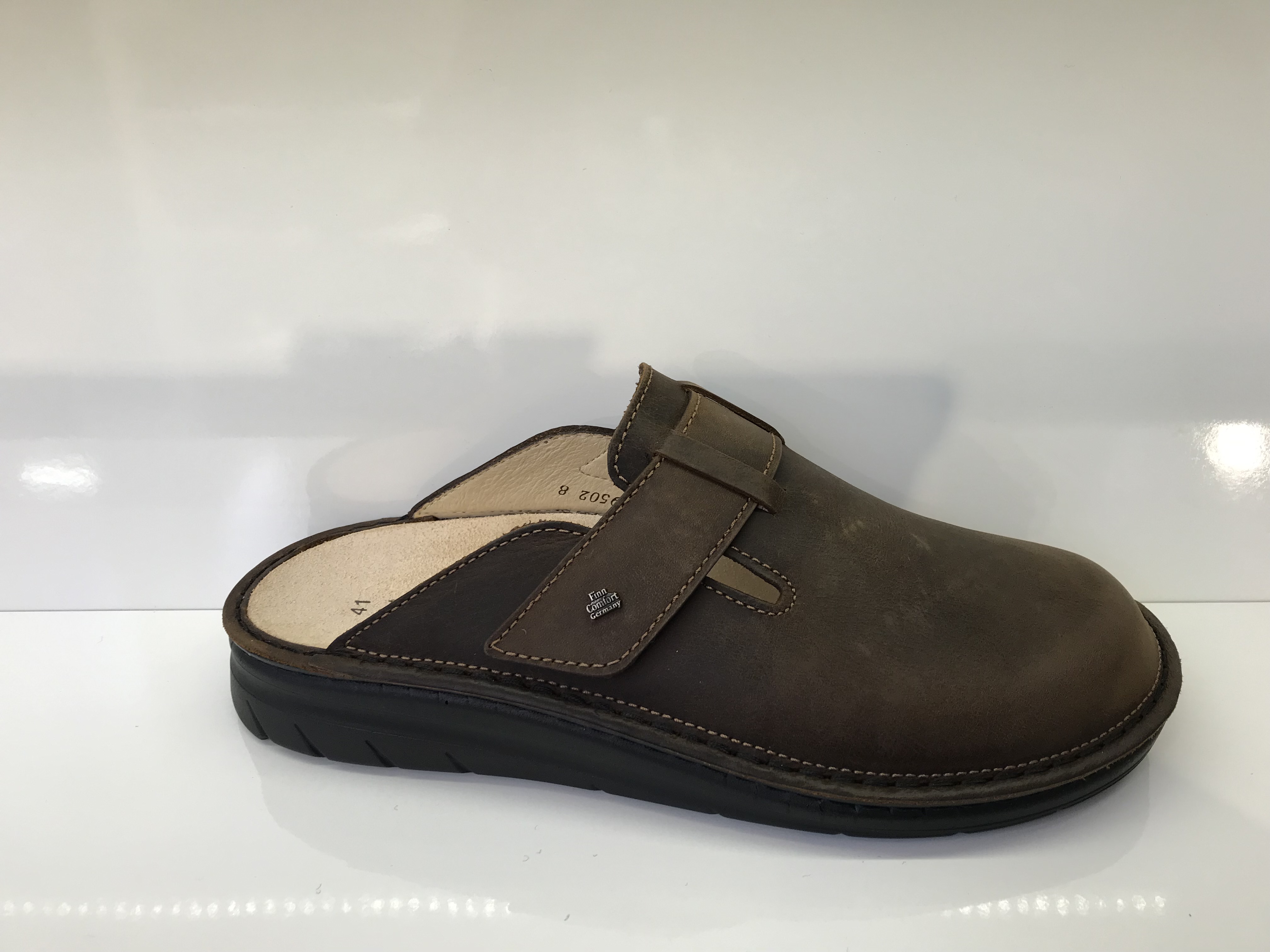 Herrenclogs von Finn Comfort; Obermaterial: Narbenleder; Innenmaterial: Lederfutter; herausnehmbare Korkußbett; verstellbar durch einen Klettverschluss; stoßdämpfende, gelenkschonende und flexible Laufsohle; Absatzhöhe: ca. 25mm; Farbe: Barrel (Braun)