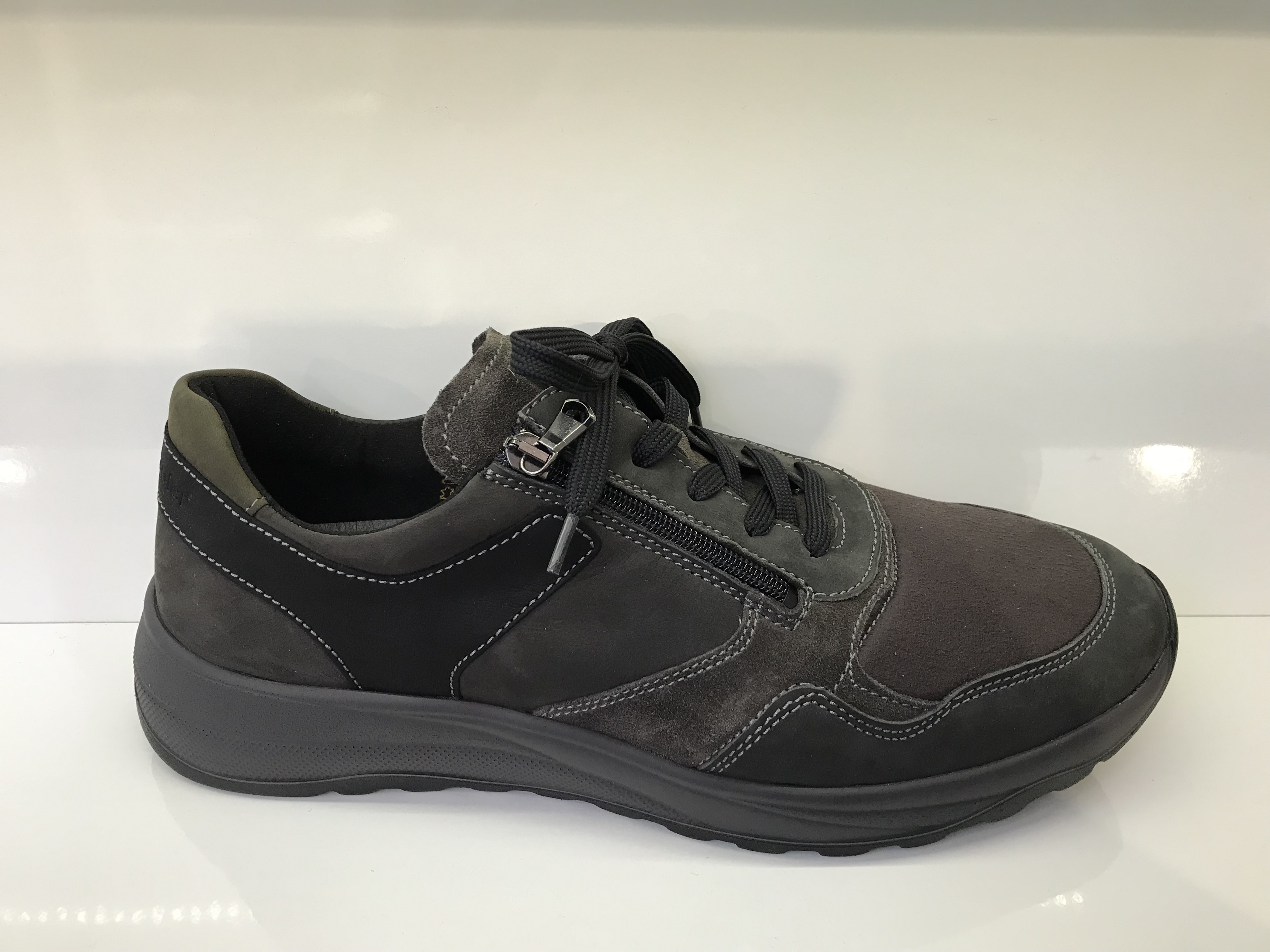 Herrenhalbschuhe von Waldläufer; Obermaterial: Nubukleder und Strechmaterial; Innenmaterial: Leder- und Textilfutter; herausnehmbares Fußbett; verstellbar durch Schnürung und einem Reißverschluss; PU-Laufsohle mit Luftpolster; Graue Sohle; Weite K; Farbe: Carbon/Schwarz