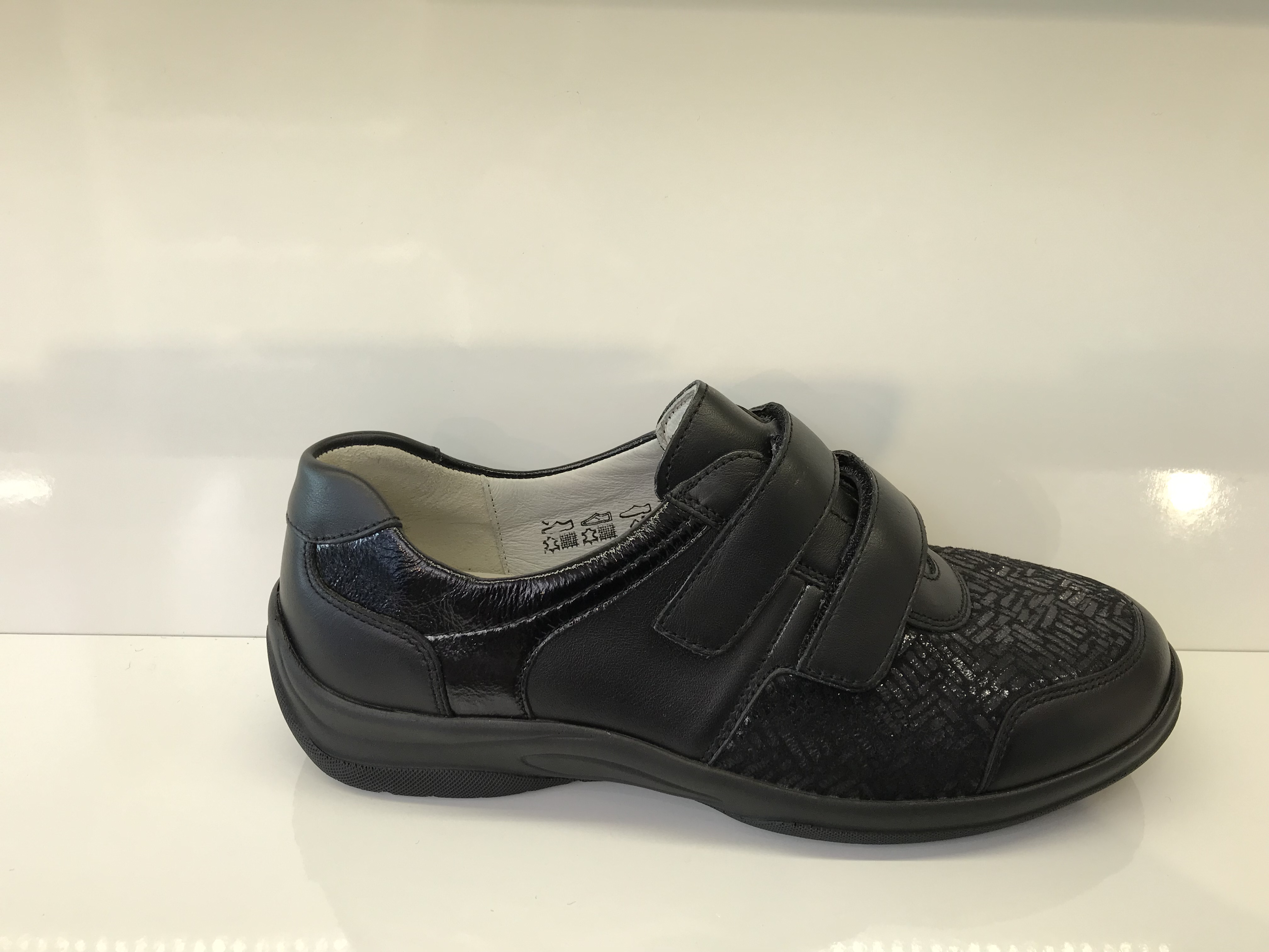 Damenhalbschuhe von Waldläufer; Obermaterial: Glatt- und Lackleder mit geprägtem Strechmaterial; Innenmaterial: Leder- und Textilfutter; verstellbar durch zwei Klettverschlüsse; herausnehmbares Fußbett; Weite H; schwarze Sohle; Sehr leicht; Farbe: Schwarz