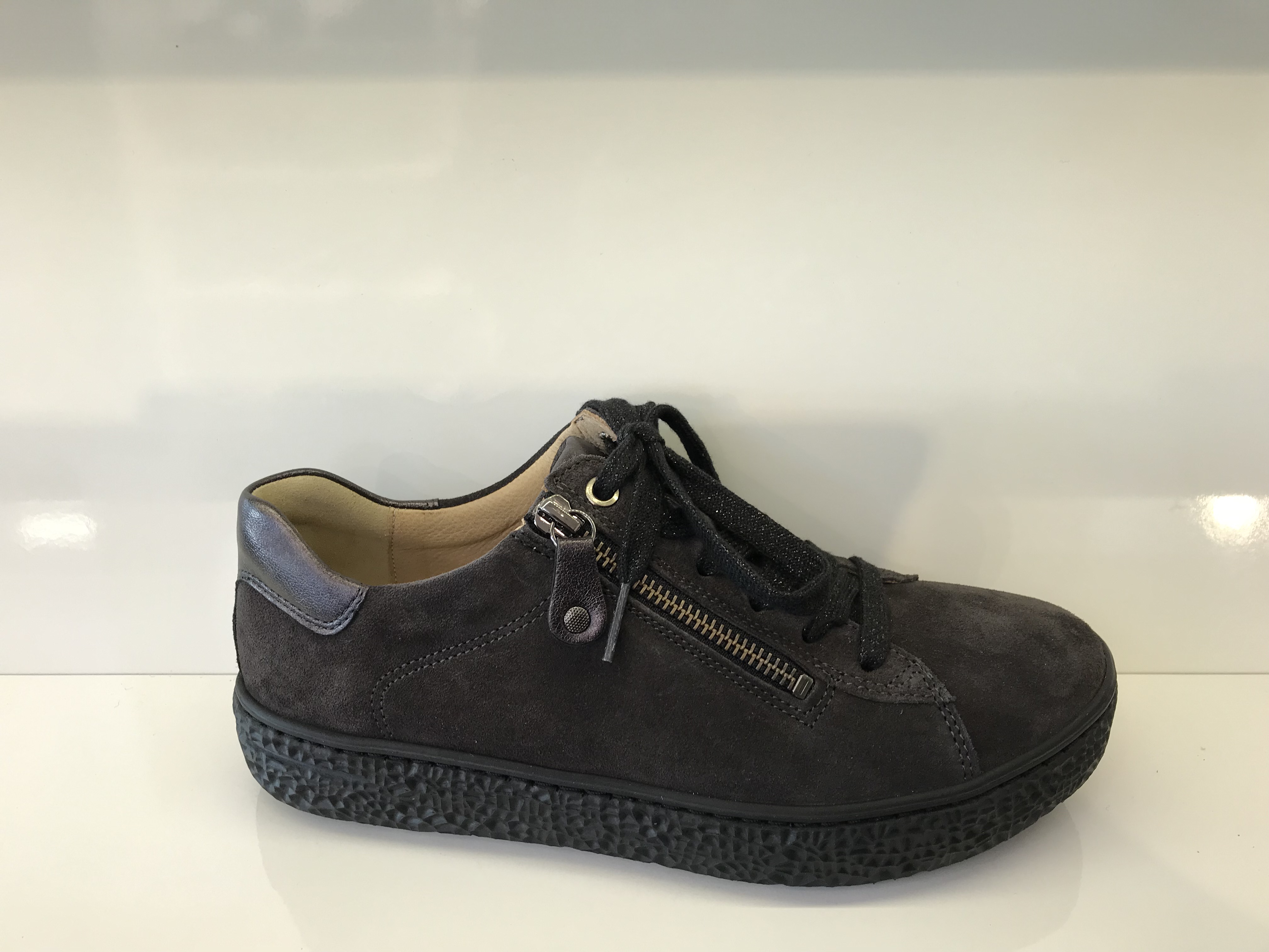 Damenhalbschuhe von Hartjes; Obermaterial: Hochwertiges Velourleder mit Prägung an der Ferse; Innenmaterial: hochwertiges Lederfutter; verstellbar durch Schnürung und einem seitlichem Reißverschluss; herausnehmbares Leichtkorkfußbett; Machart: gestrobelt; Weite H; Farbe: Granit-Smoke