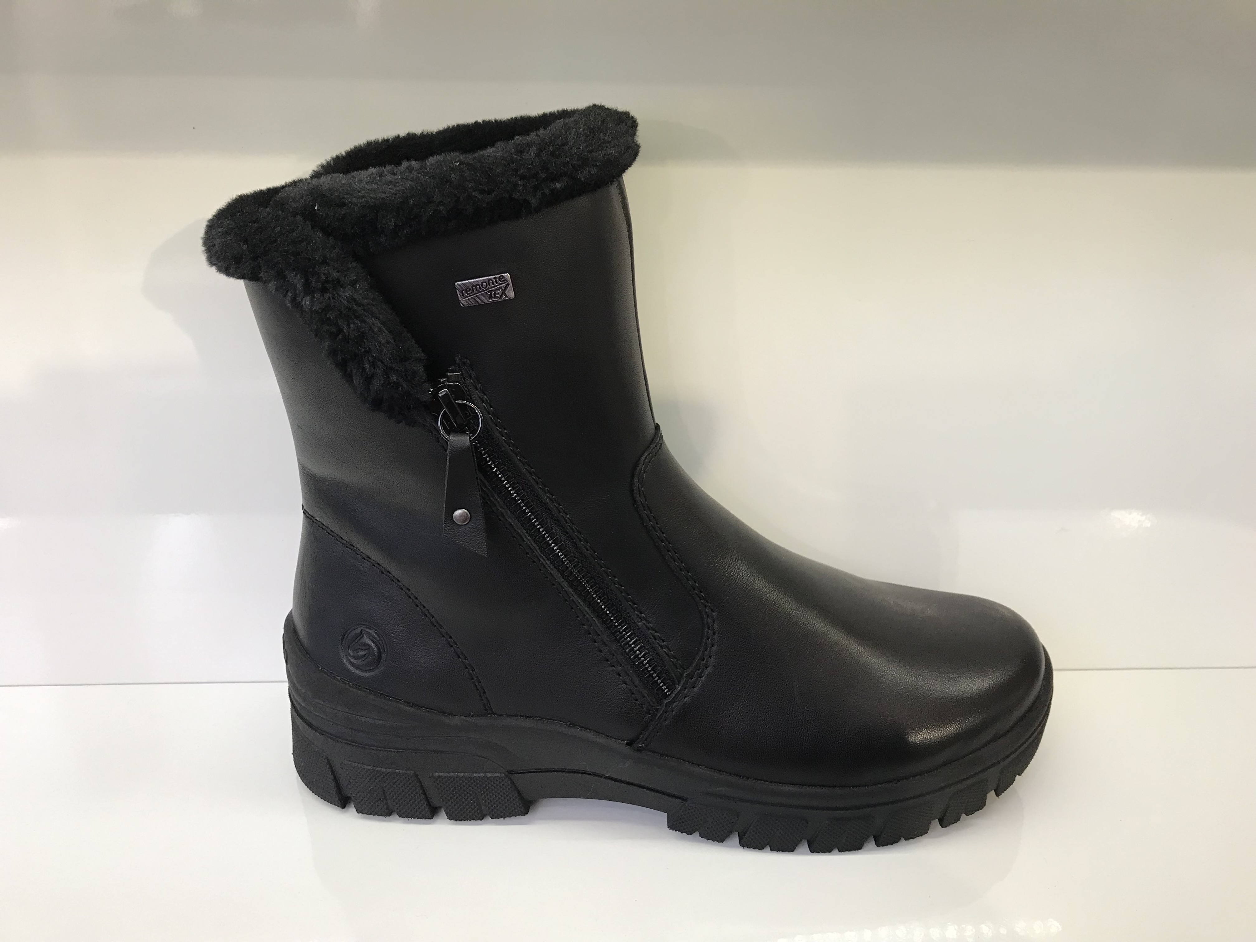 Damenstiefel von Remonte; Obermaterial: Glattleder mit Plüschrand am Schaft; Innematerial: Warmes Lammfellfutter; mit Membrane; herausnehmbares Fußbett; verstellbar durch zwei Reißverschlüsse; schwarze Sohle; PU-Laufsohle; mit Profilsohle; Farbe: Schwarz/Nero