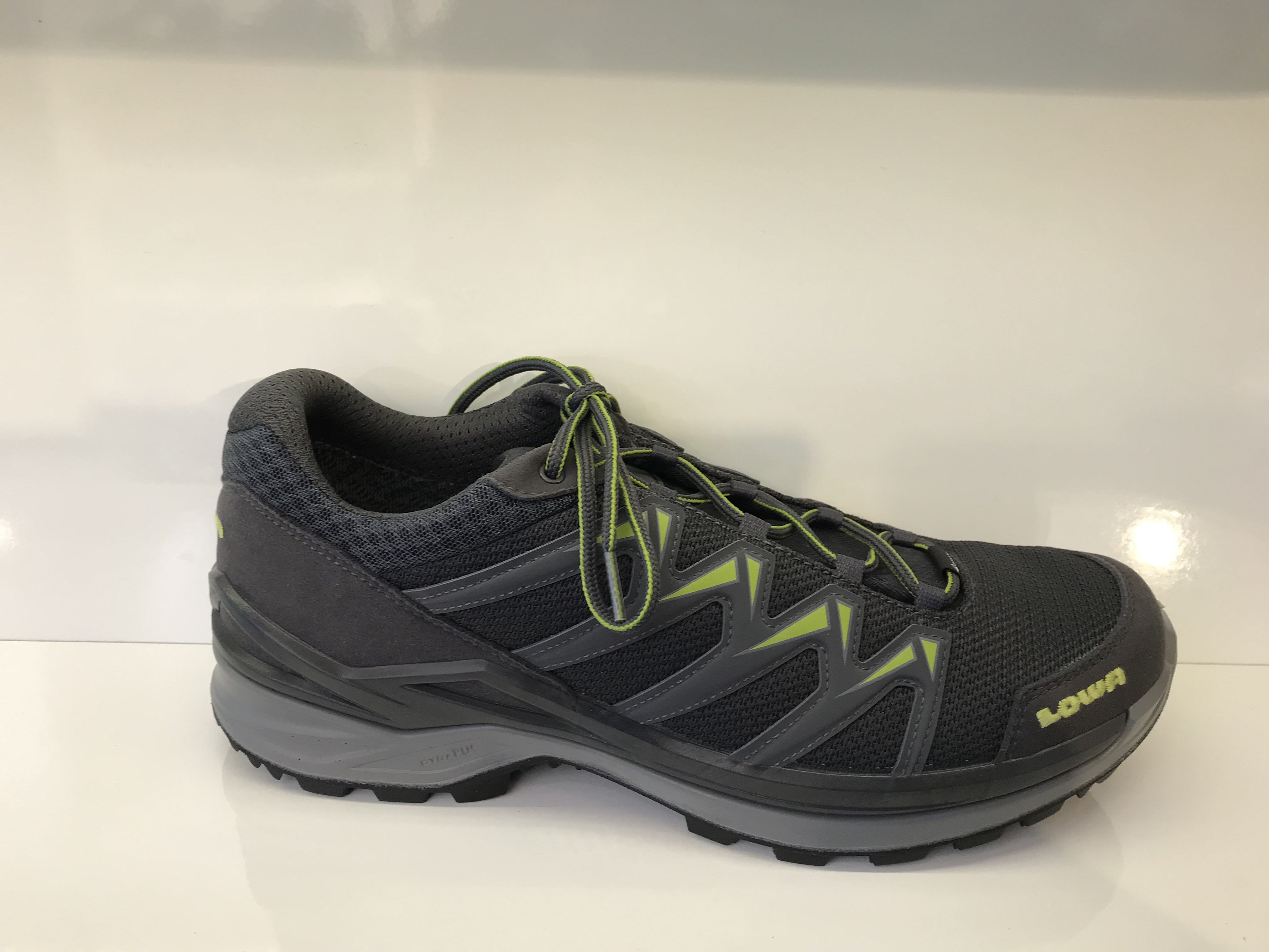 Herrenwanderschuhe von Lowa; Obermaterial: Textil- und Synthetikmaterial; Innenmaterial: Textilfutter; herausnehmbarem Fußbett; atmungsaktiv und wasserabweisend durch Gore-Tex; Sohle: Lowa MultiTrac; dreieckige Profilgestaltung für multifunktionalle Gelände; Verstellbar durch Schnürung; Farbe: Anthrazit/Avocado