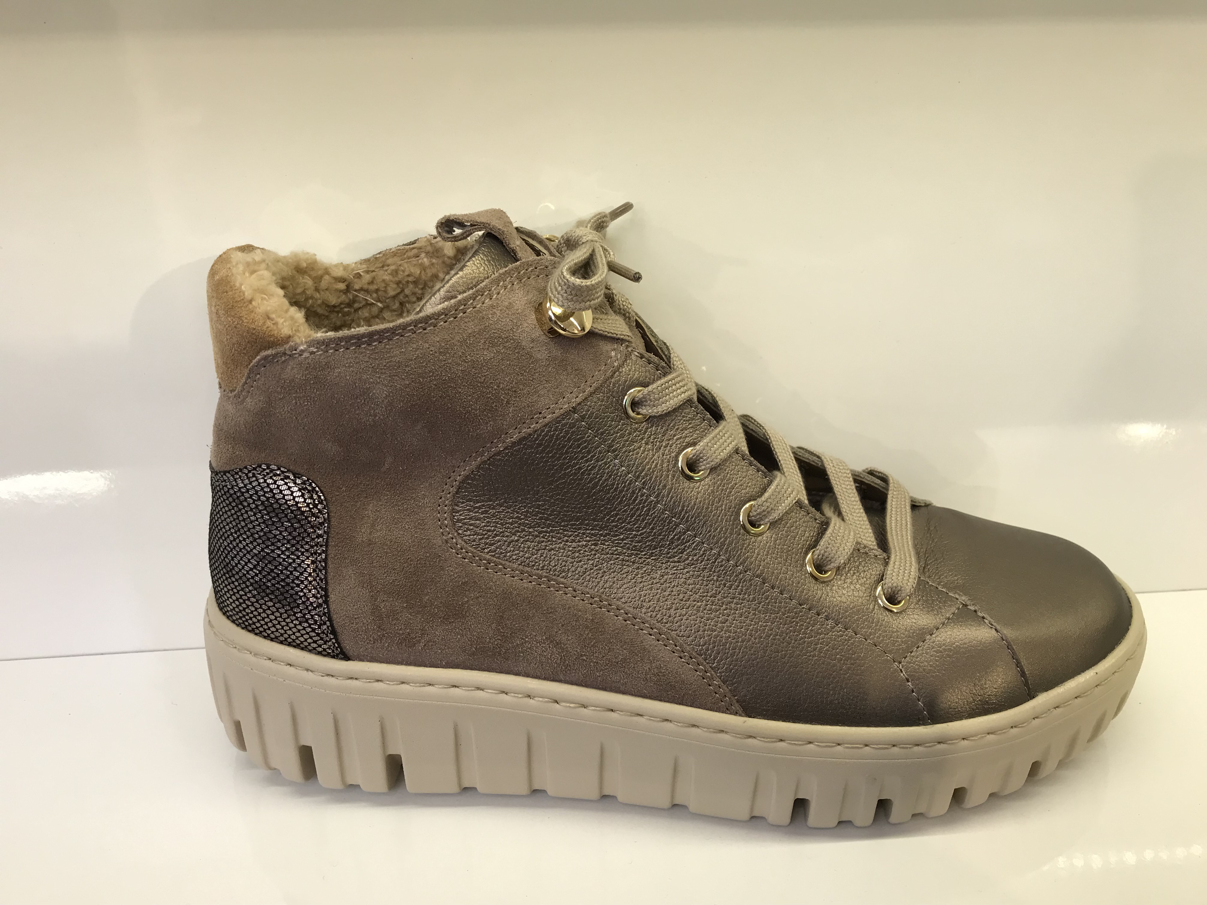 Damenstiefelette von Waldläufer; Obermaterial: Nubukleder und Glattleder; Innenmaterial: warmes Plüschfutter; herausnehmbares Fußbett; verstellbar durch Schnürung und einen zusätzlichem Reißverschluss; Weite H; Beige Sohle (Hell); Sehr Leicht; Farbe: Bronce/Nougat/Toffee