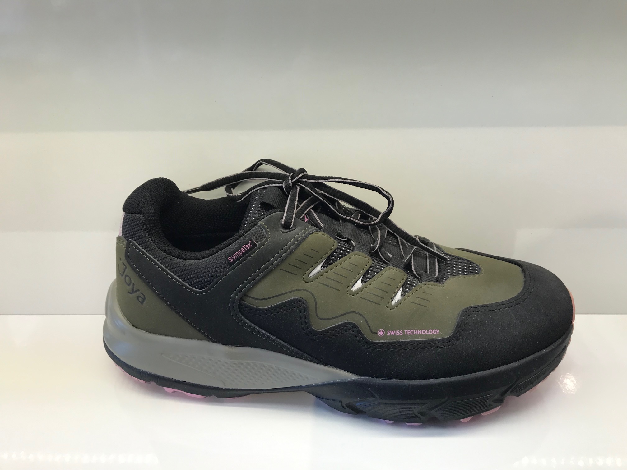 Damenaktivschuhe von Joya; Obermaterial: Nubukeder und Textilmaterial; Innenmaterial: Textilfutter; herausnehmbares Ortholite Support-Fußbett; verstellbar durch Schnürung; mit SympaTex: wasserabweisend und atmungsaktiv; sehr stoßdämpfend; Sohlenform: Active (weiche und federnde Sohlenmaterial entlastet Rücken und Füße); stabiler Stand mit rutschfester Profilierung; Weite H; Farbe: Grün (Grün/Schwarz/Rosa)